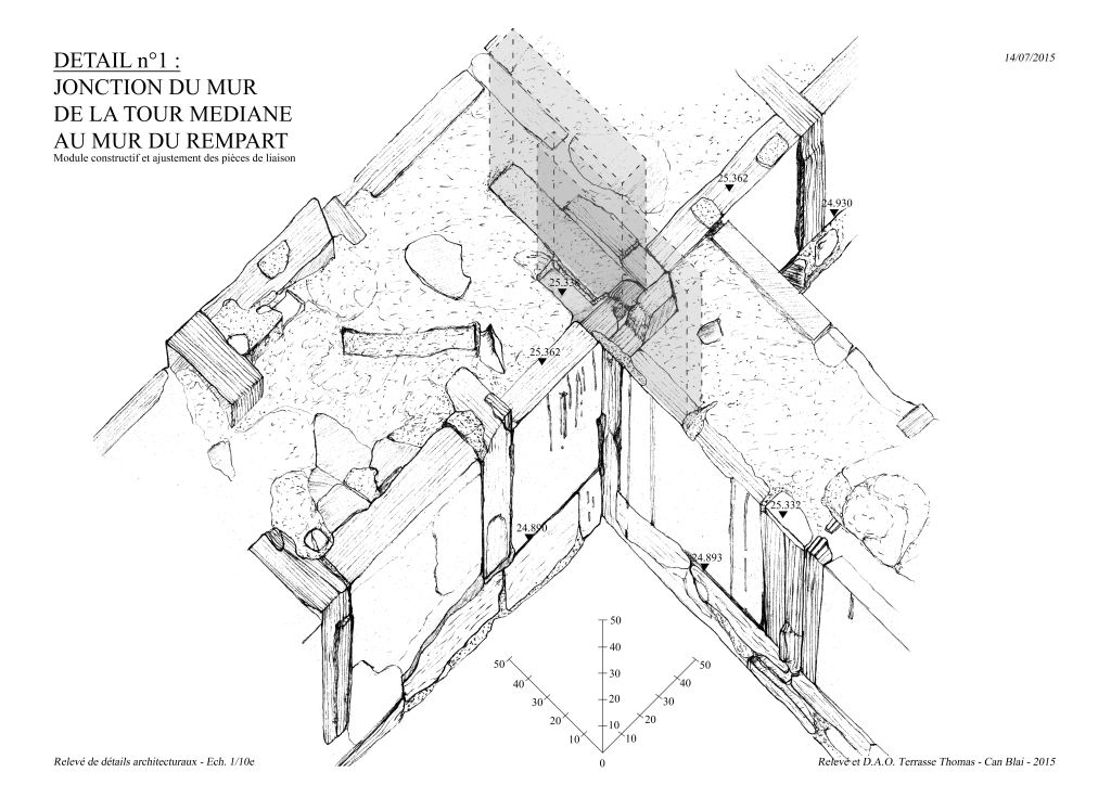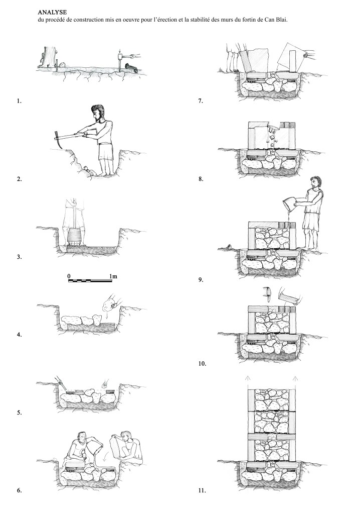 Relevé du plan pierre à pierreNuage de point dense exprimé en PCVCroquis progressif de la fondation d’un mur avec la technique de l’emplectonMinute de terrain axonométrique d’un détail constructifVue axonométrique fonctionnelle du fortin