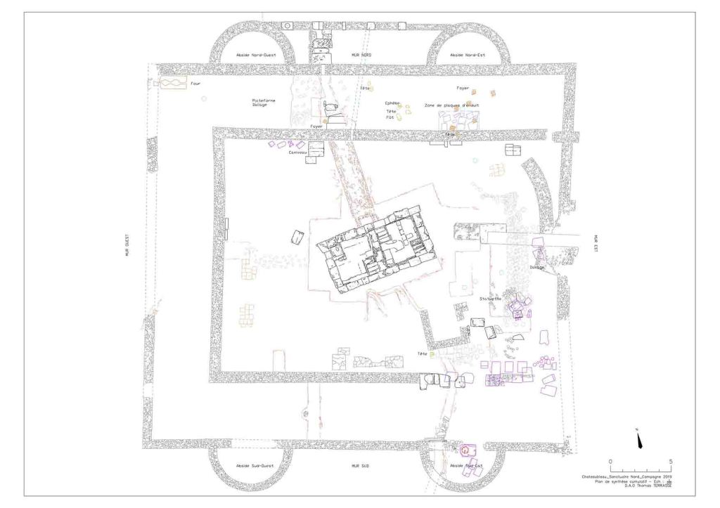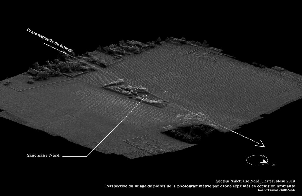 Relevé architectural du Sanctuaire Nord, fusion des archives planimétriques, relevé de la morphologie du terrain environnant et mise en relief du thalweg acheminant naturellement l’eau vers ce sanctuaire.
