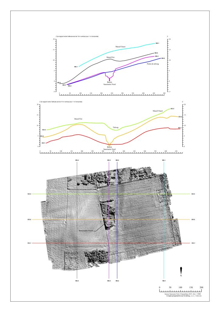 Encadrement d’une équipe.Relevé photogrammétrique planimétrique et d’élévationMise en relief du thalwegMorphologie du terrain exprimée en coupes successivesPlan cumulatif du Sanctuaire NordOrthophoto par drone. Le sanctuaire dans son environnement moderne