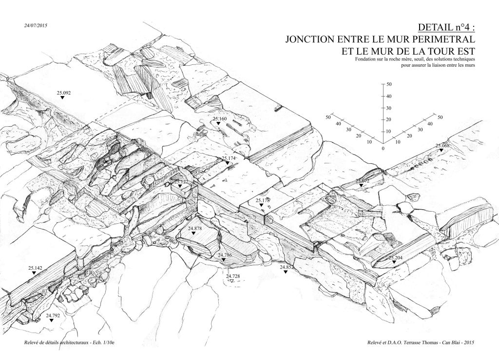 Ma formation en architecture m’a instruit de ce savoir faire, et de cette compréhension des processus d’édification du patrimoine bâti dont les vestiges sont les témoins. Aussi, par le dessin, je recherche ces procédés constructifs et les mets en exergue, des structures en creux aux fondations, de la diversité des matériaux employés, les modules de constructions, l’analyse des traces d’outils et des éléments de charpente disparus. Le dessin est d’une part analytique, de par le relevé du vestige dans son état présent, et il est d’autre part un outil de recherche, par la restitution des logiques constructives permettant d’initier des hypothèses de restitution des parties aujourd’hui disparues.