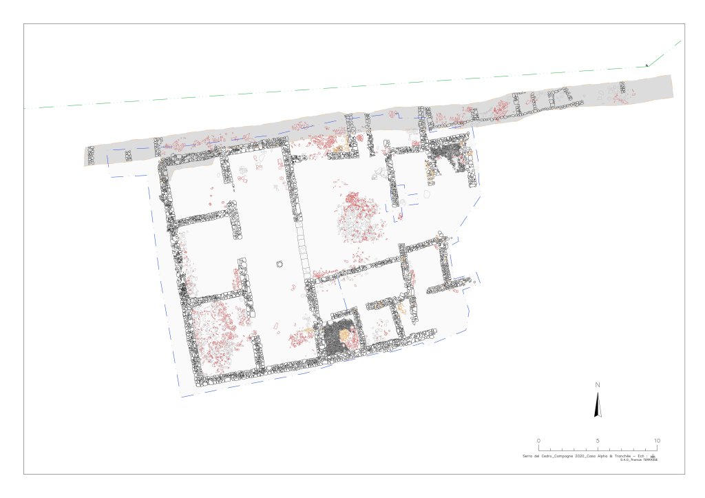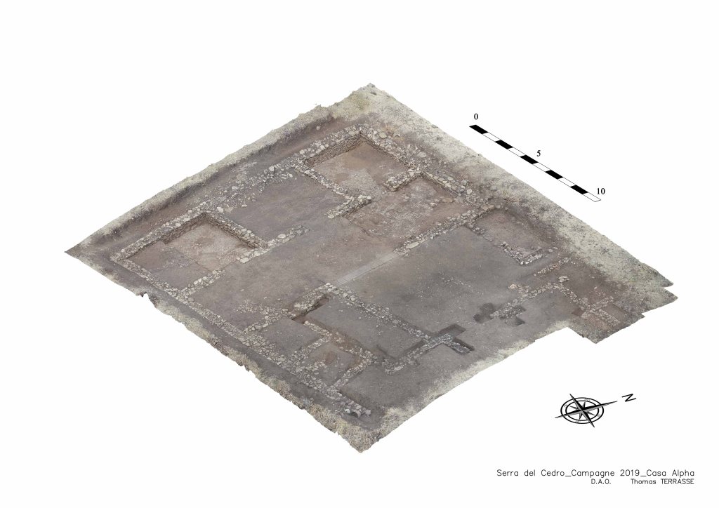 Dalle orthophotographique du site générée grâce à un quadrillage photographique extensif par droneNuage de point dense généré par PCV du site archéologiqueRelevé pierre à pierre de la casa alphaCoupes photogrammétriques et dessin technique